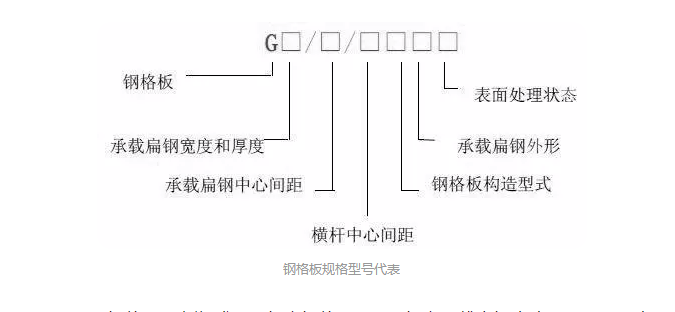 G253/30/50鋼格板最新標準:G代表鋼格板;253代表承載扁鋼寬度25mm,厚度3mm;承載扁鋼間距30mm,橫桿50mm;扁鋼構造形式W代表壓焊(在標記中可省略),L代表壓鎖(也就是我們常說的插接鋼格板);承載扁鋼外型F代表平面型扁鋼(可省略),I代表I型鋼,S代表齒形扁鋼;表面處理狀態G代表熱鍍鋅,P代表涂漆,U代表表面不處理